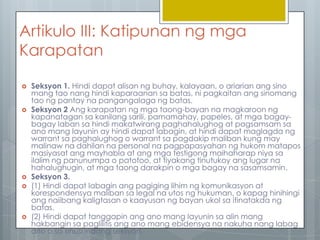 Artikulo ng Karapatang Pantao 1987 Artikulo 2 a. Ang kasalukuyang saligang batas ng Pilipinas ay pinagtibay noong Pebrero 21987 sa isang plebiscite kung saan ang higit sa 34 o 7637 ng mga humalal 17059495 ang bumoto ng sangayon. Ang karapatan ng mga tao na maging ligtas sa kanilang mga tao bahay papel at epekto laban sa hindi makatuwirang paghahanap at pag-agaw ng anumang kalikasan at para sa anumang layunin ay hindi nalalabag at walang search war o warrant of aresto ang dapat maglabas maliban sa.